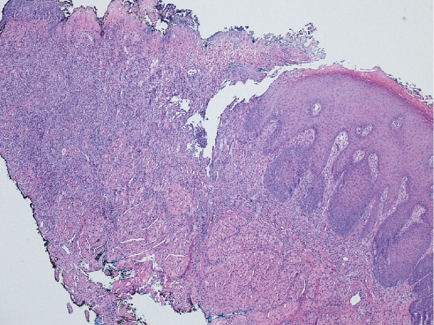 Re-analysis of previous biopsy of the lesion reveals mucosal ulceration extending deep into the underlying regional skeletal muscle tissue (Figure 2).